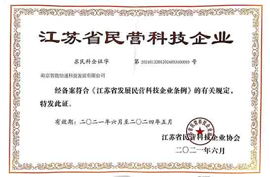 经过严格的评审和认定,南京智能信通科技发展有限公司被评定为“江苏省民营科技企业”。江苏省民营科技企业是为强化科技对加快转变发展方式、推动经济转型升级的支撑引领作用,进一步推动民营科技企业依靠自主创新取得又快又好发展而设立的。此次殊荣的获得是对我司自主创新成果的肯定与认可,同时也是对我司在研发创新道路上的一种激励和鞭策,我们将进一步提升自主创新能力,加强自身的核心竞争力。